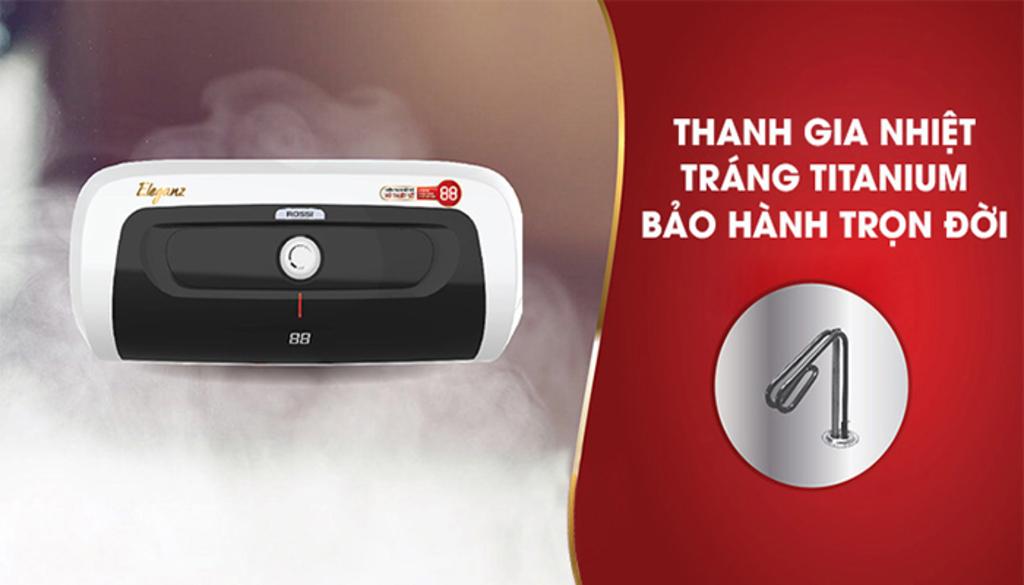 - Thanh gia nhiệt tráng Titanium bảo hành trọn đời: Titanium có khả năng dẫn nhiệt tốt, giúp sản phẩm nhanh chóng và đều hóa nhiệt độ khi sử dụng, mang đến nước nóng nhanh chóng, chống bám cặn và cam kết bảo hành trọn đời.