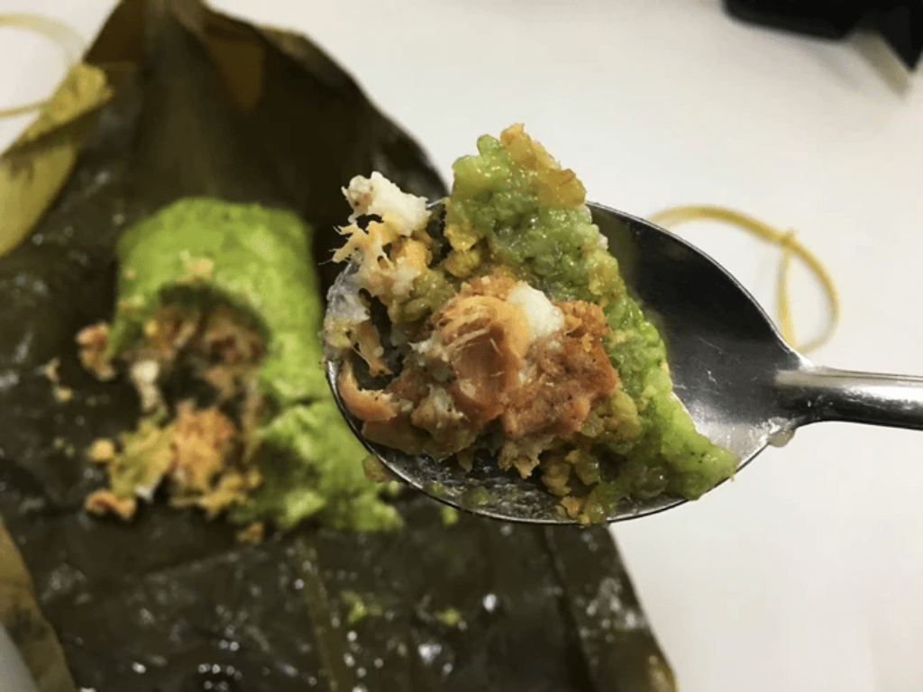 Khi bóc ra, lá dong tỏa mùi thơm tự nhiên, gạo nếp dẻo dai mà không dính, phần đậu xanh bùi mịn, thịt béo ngậy vừa phải, tạo vị hài hòa đậm chất núi rừng.