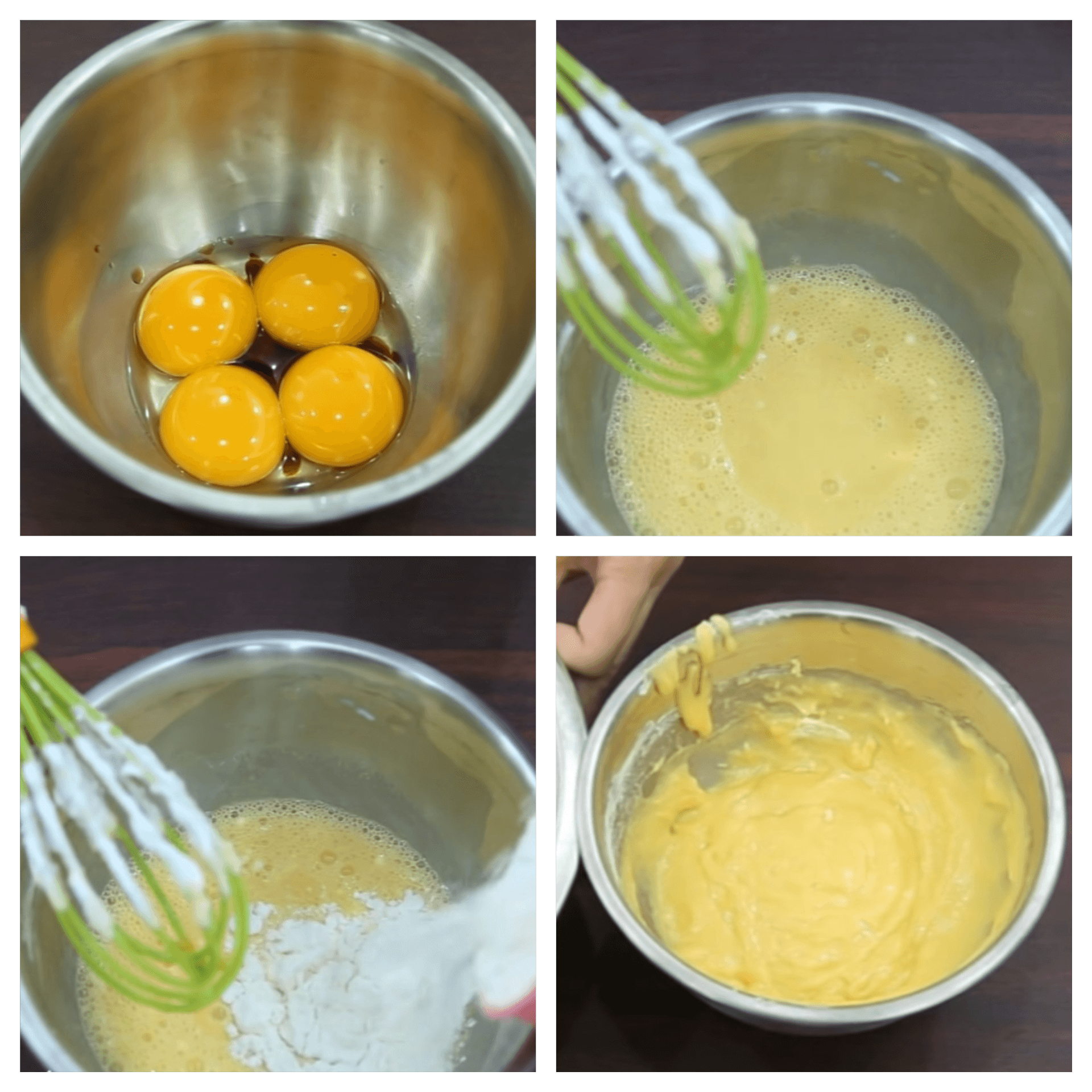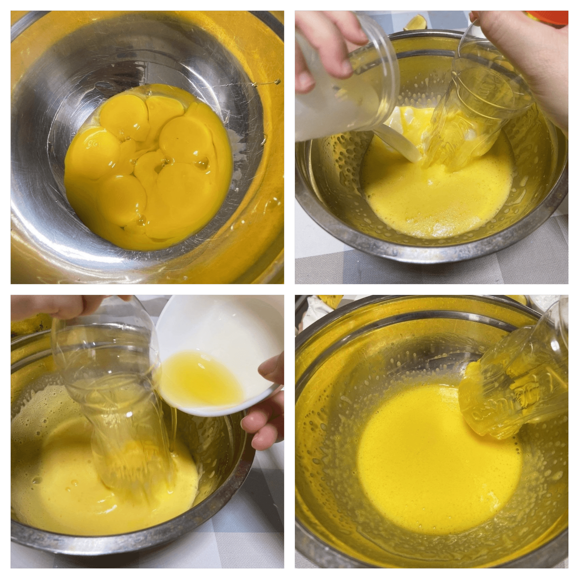 Trước tiên đánh lòng đỏ trứng cho bông lên bằng dụng cụ đánh trứng được làm từ chai nhựa cắt bỏ phần đáy chai và tạo hình dạng tua rua phía dưới chai. Bạn đánh đều tay liên tục cho đến khi lòng đỏ được bông phồng lên và có màu vàng nhạt.