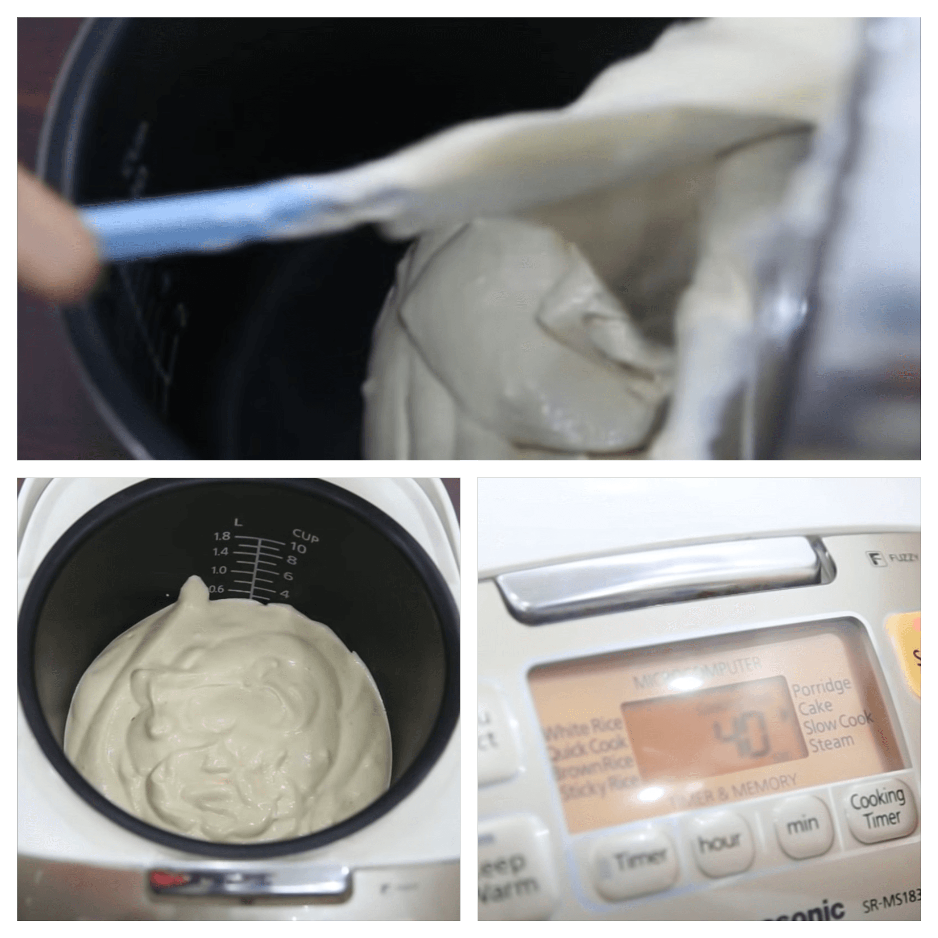 Sau đó cho toàn bộ tô bột trứng đã đánh mịn vừa nãy vào nồi cơm điện, đậy nắp nồi và bật nút nấu cơm như bình thường.