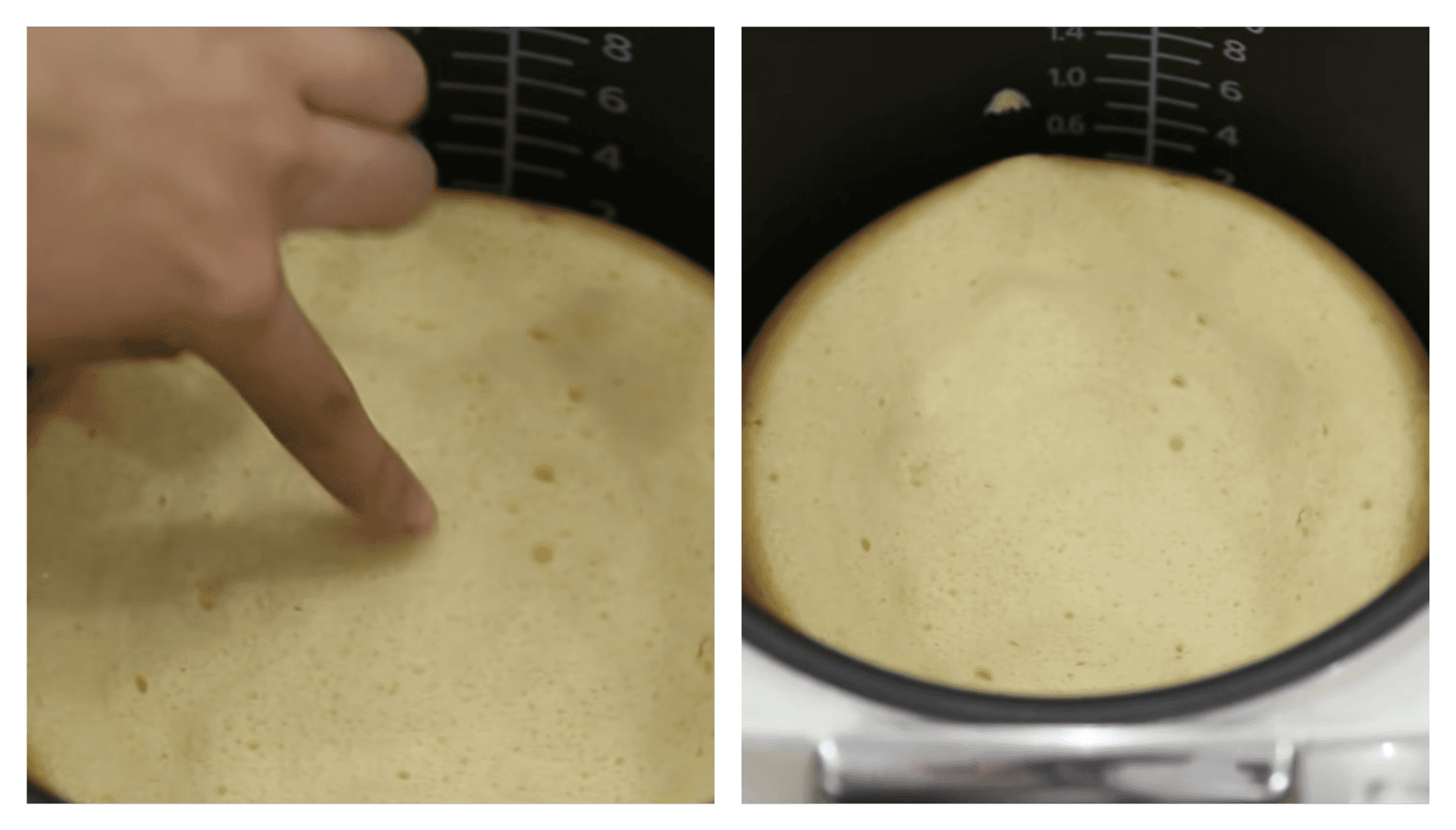 Khi nồi nấu xong và nút nhảy tới nút giữ ấm (keep warm) lần nữa thì để yên như vậy khoảng 20 phút, sau đó mở nắp ghim cây tăm vào thử bánh, nếu bánh không dính vào tăm là bánh đã chín.