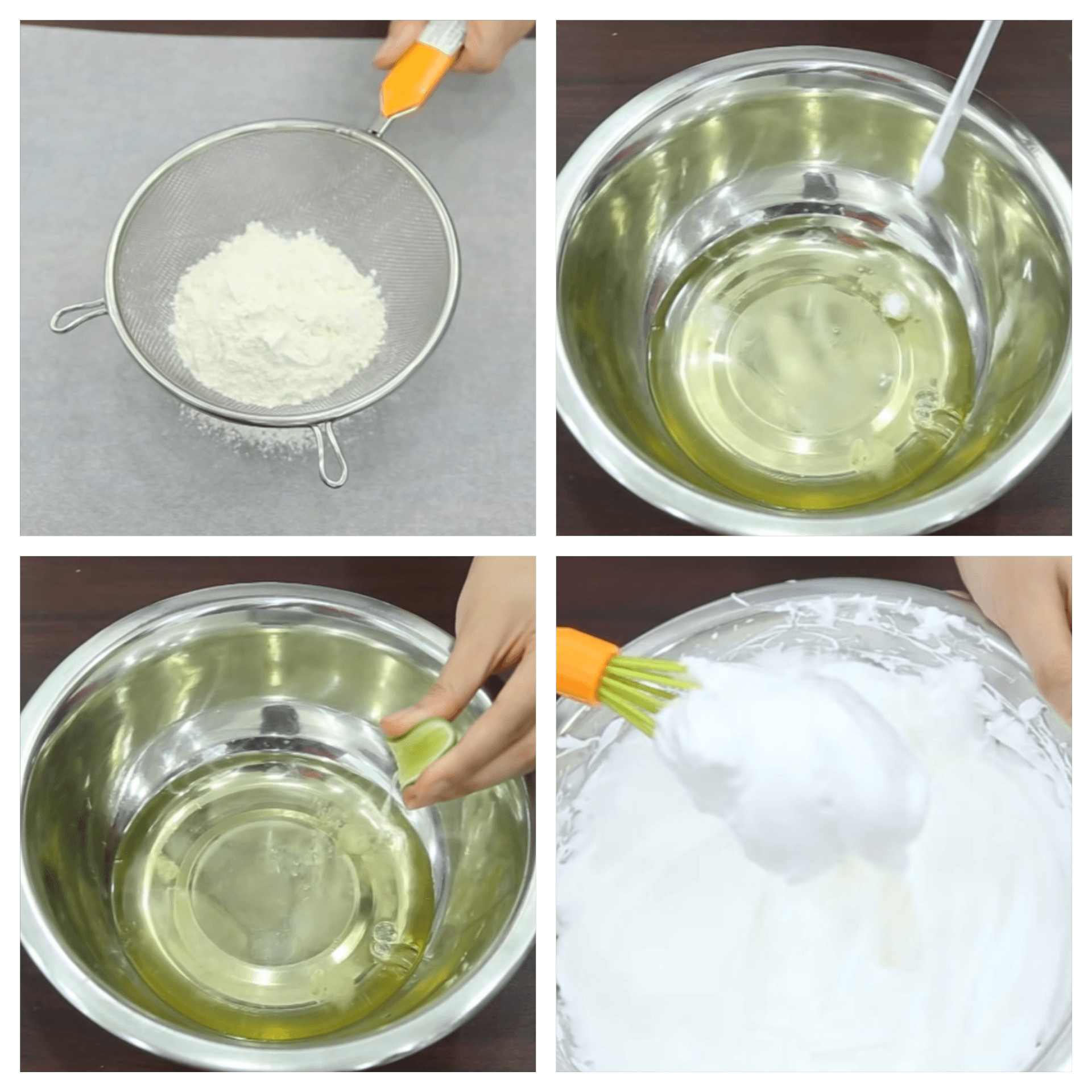Tiếp đó dùng rây lọc, rây từ từ bột bắp và bột mì vào hỗn hợp lòng đỏ trứng, vừa cho vừa đánh, trộn đều từ ngoài vào trong sao cho hỗn hợp bột trứng được mịn, khi bột mịn hoàn toàn thì dùng màng bọc thực phẩm bọc kín miệng tô rồi ủ sang một bên.
