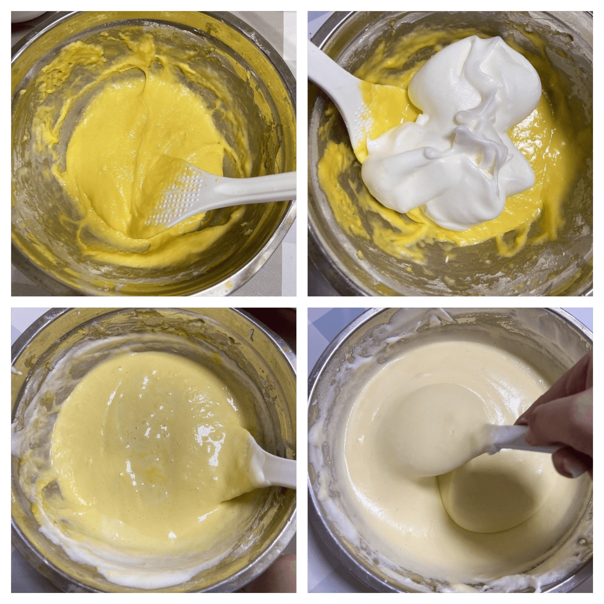 Cuối cùng cho từ từ lòng trắng trứng đã đánh bông vào hỗn hợp lòng đỏ trứng bột đã ủ lúc nãy. Trộn đều từ ngoài vào trong nhẹ tay để bọt khí không bị bể, trộn đến khi lòng trắng trứng hòa đều vào hỗn hợp và hỗn hợp đã mịn là được.