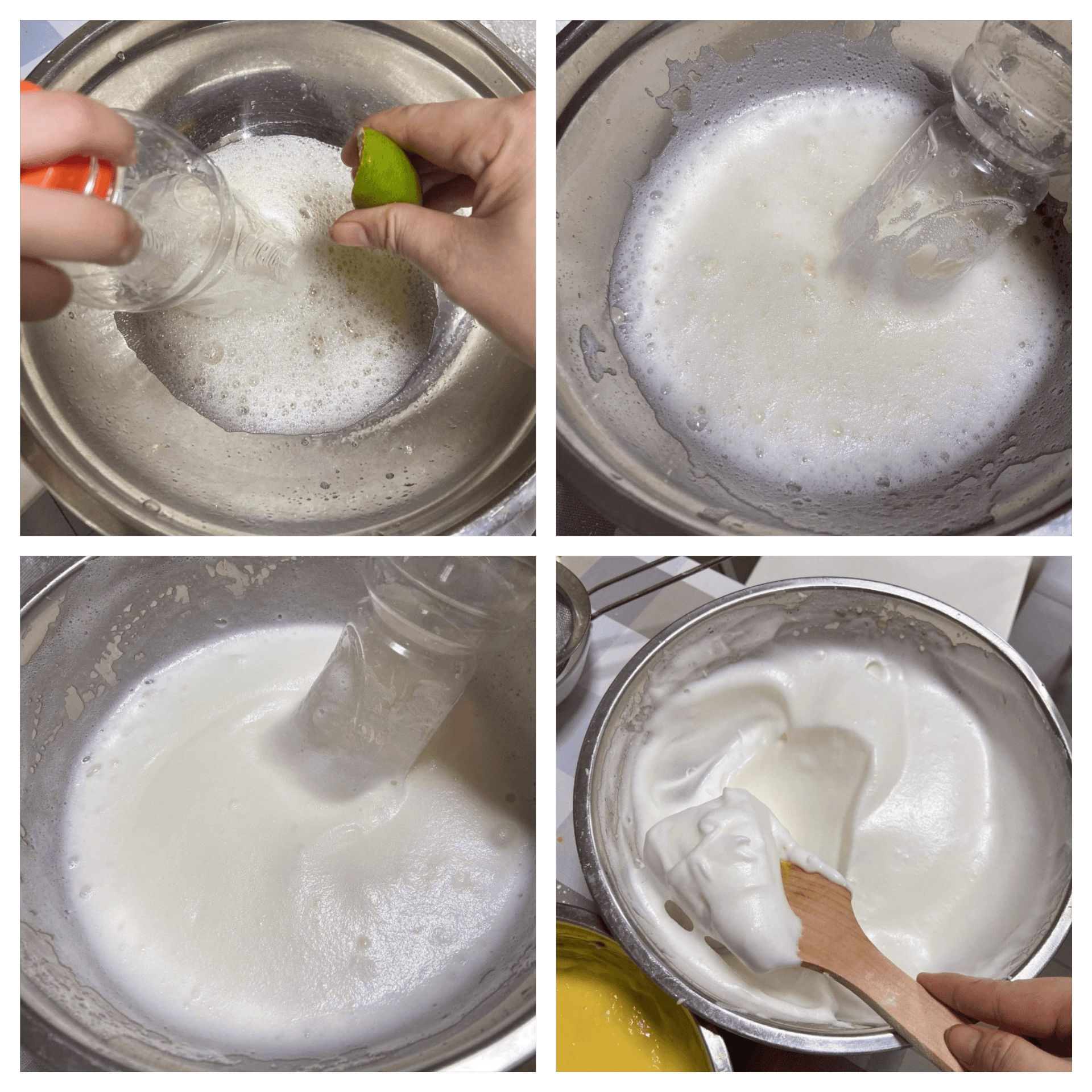 Tương tự như lòng đỏ, bạn cũng dùng dụng cụ đánh bông đánh đều lòng trắng trứng, cho thêm nước cốt chanh và 1 ít muối vào đánh đều tay.