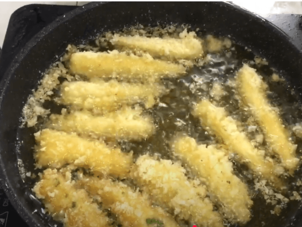 - Lật bắp non đều tay khi chiên để vỏ bột giòn đều hai mặt.
