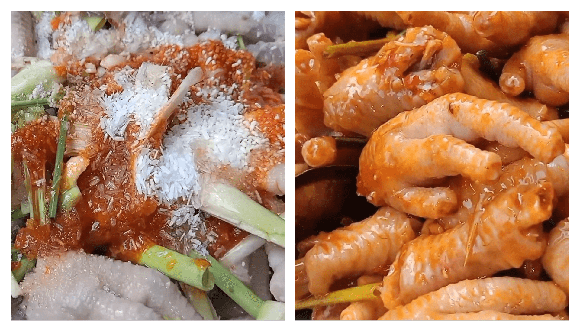 Chân gà sốt Thái cóc non có màu sắc vô cùng bắt mắt, những chiếc chân gà thì giòn với gia vị chua chua ngọt ngọt kích thích vị giác, khi ăn kết hợp với cóc non vô cùng hấp dẫn.