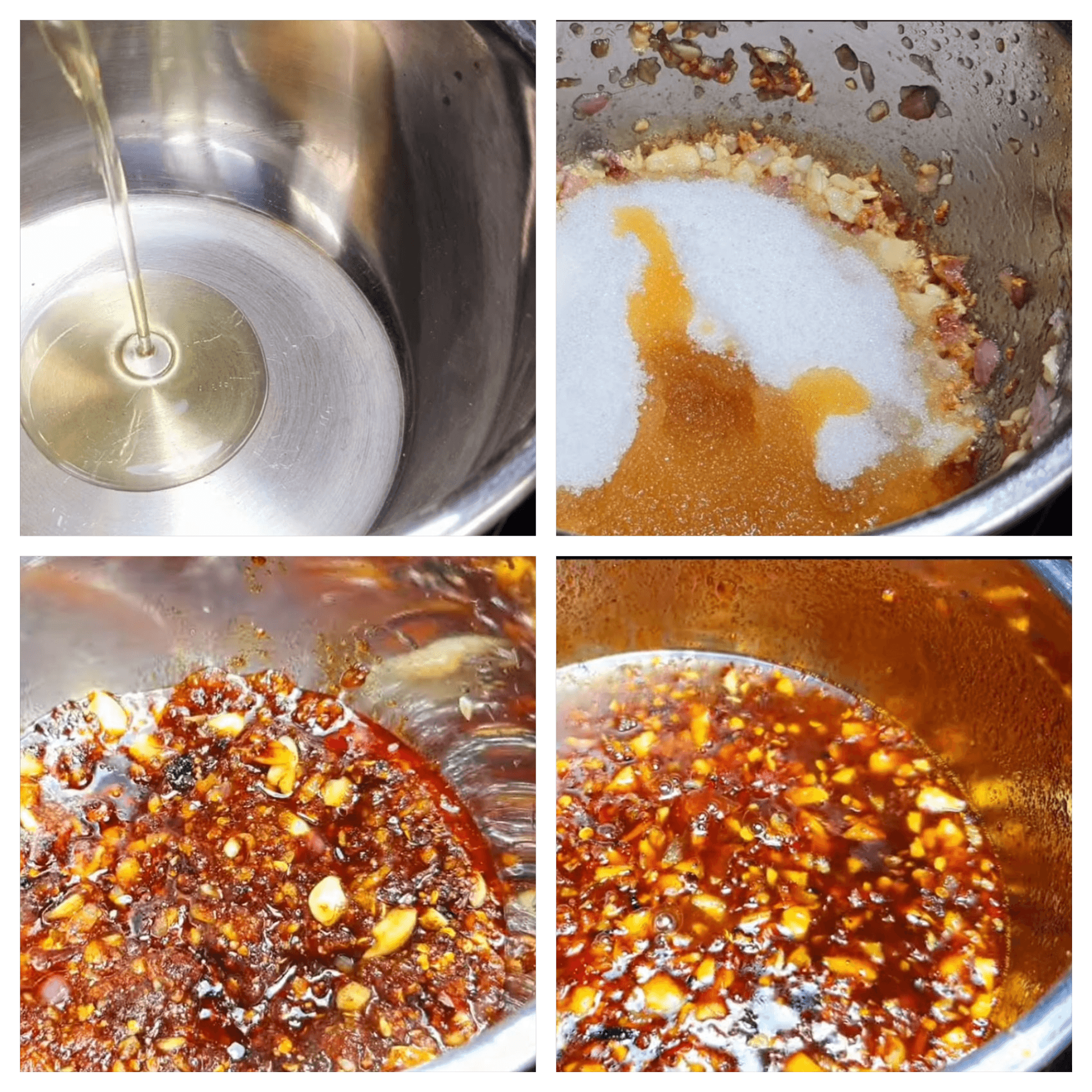 Cho 1 cái nồi lên bếp, cho vào 5 muỗng canh dầu ăn, đợi dầu sôi thì cho phần hành tím và tỏi đã băm vào phi cho vàng thì hạ nhỏ lửa và cho tiếp 250 gram đường, 2 muỗng canh muối tôm, 2 muỗng canh nước mắm, 1/2 muỗng canh ớt khô, 1 muỗng canh tương ớt, 2 muỗng canh bột ớt, dùng đũa trộn đều.