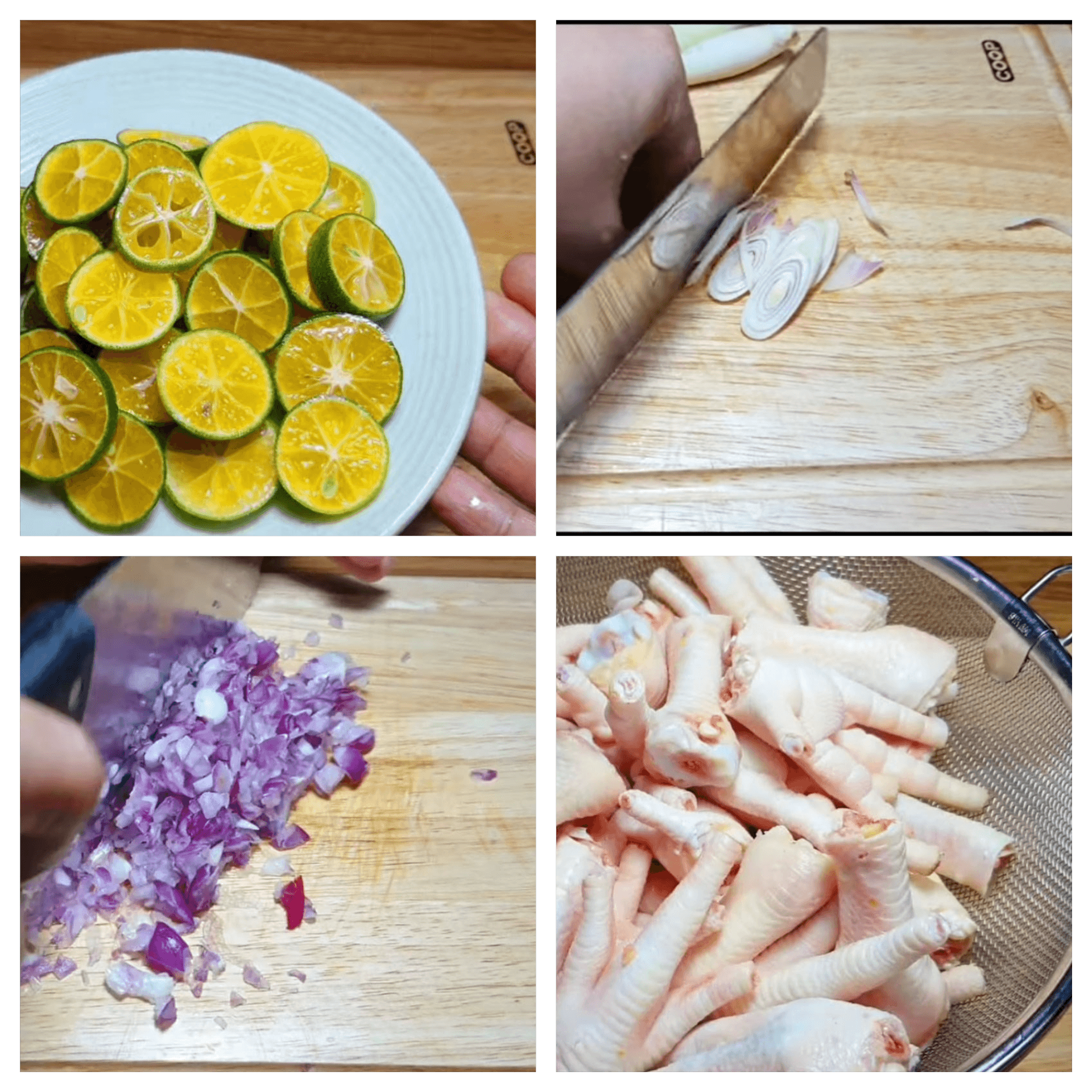 Tỏi đập dập và băm nhuyễn, hành tím cũng đập dập và băm nhuyễn, giữ lại 3 củ đập dập không băm để luộc chân gà. Tắc bạn chia làm 2 phần, 1 phần vắt lấy nước, 1 phần cắt thành khoanh tròn, bỏ hạt để trộn không bị đắng. Ớt bỏ cuống, rửa sạch và cắt lát.