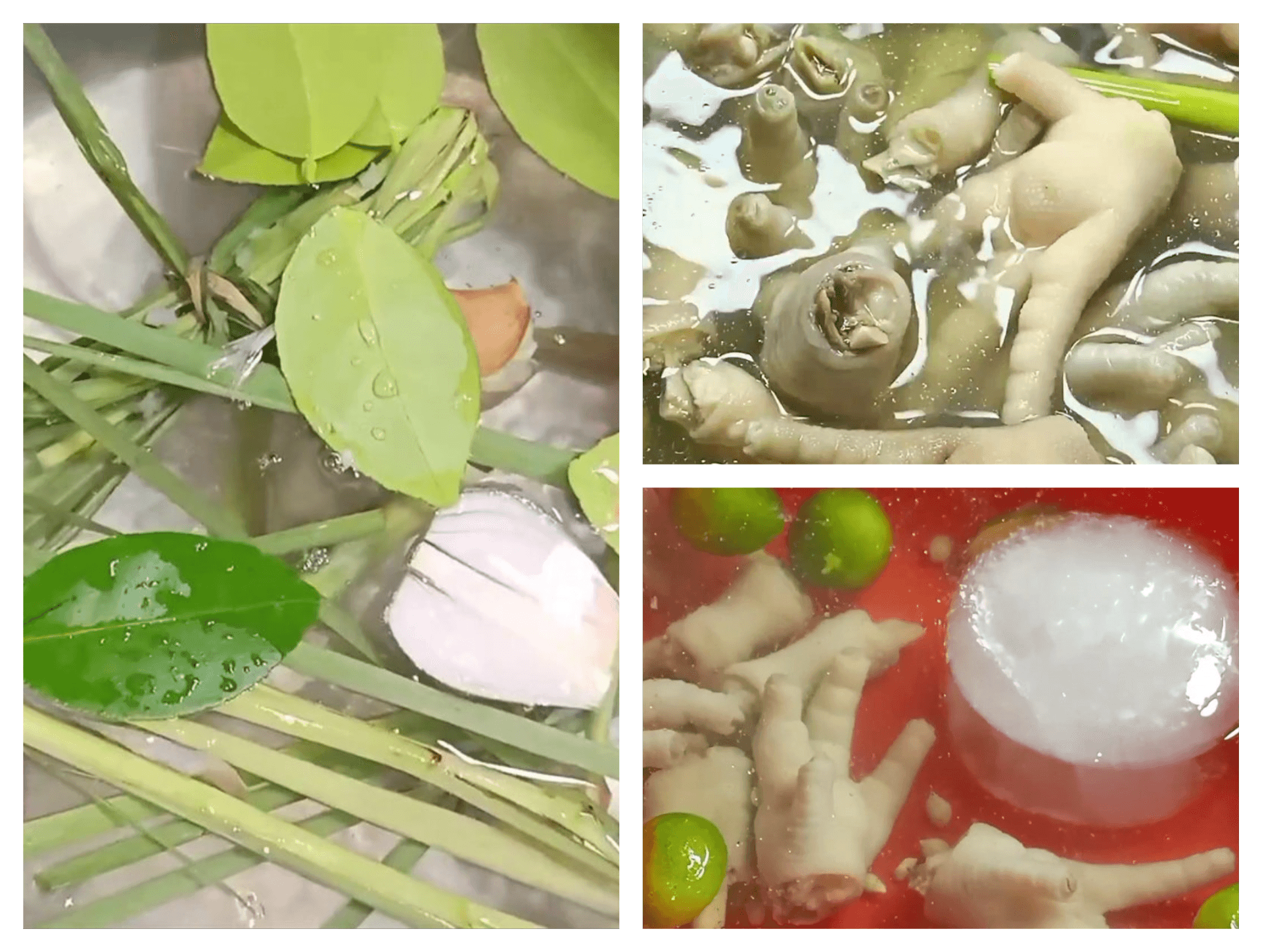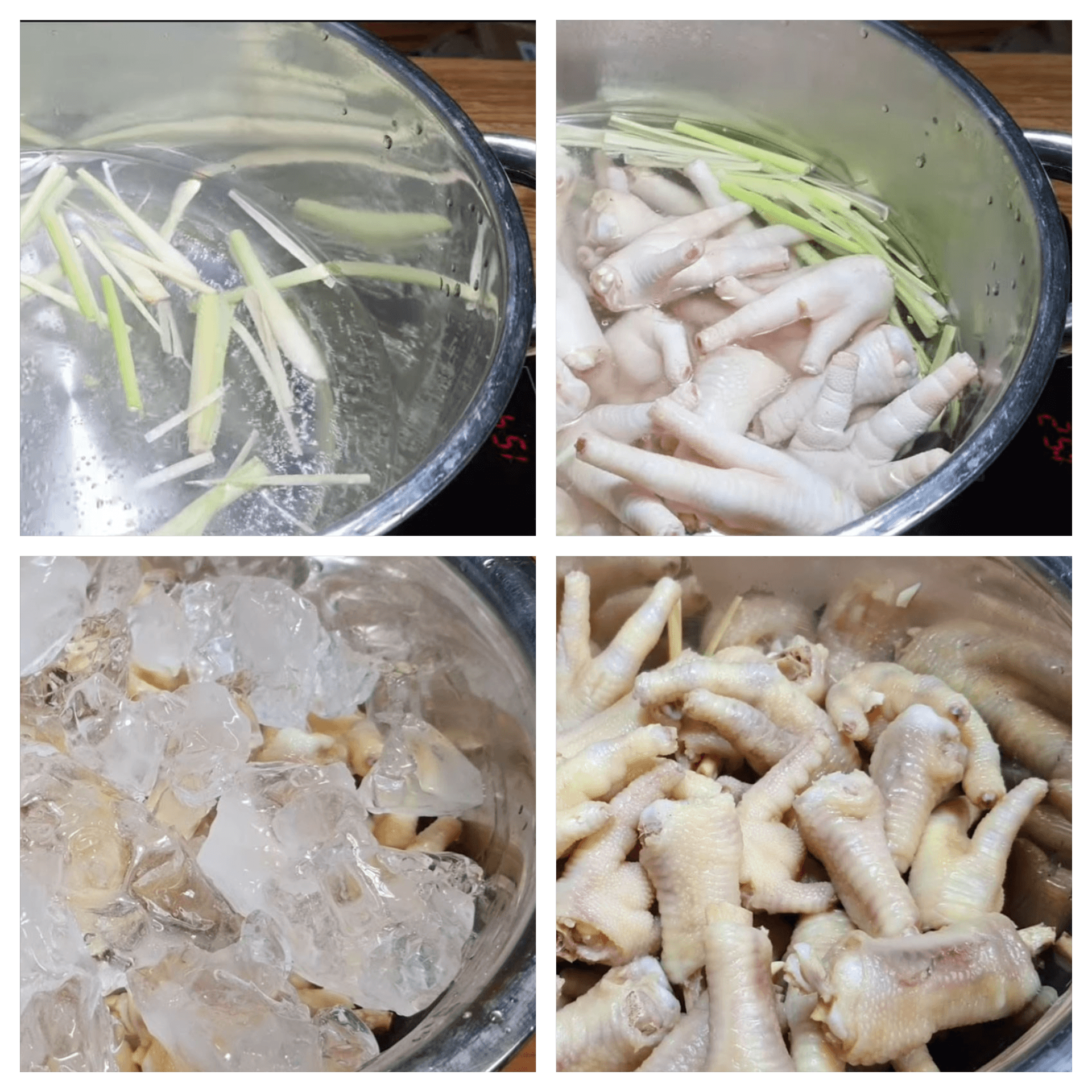 Khi nước sôi thì cho chân gà vào trụng sơ đến khi chân gà săn lại thì vớt ra ngâm với nước đá lạnh có pha ít tắc trong 15 - 20 phút thì vớt ra, để ráo.