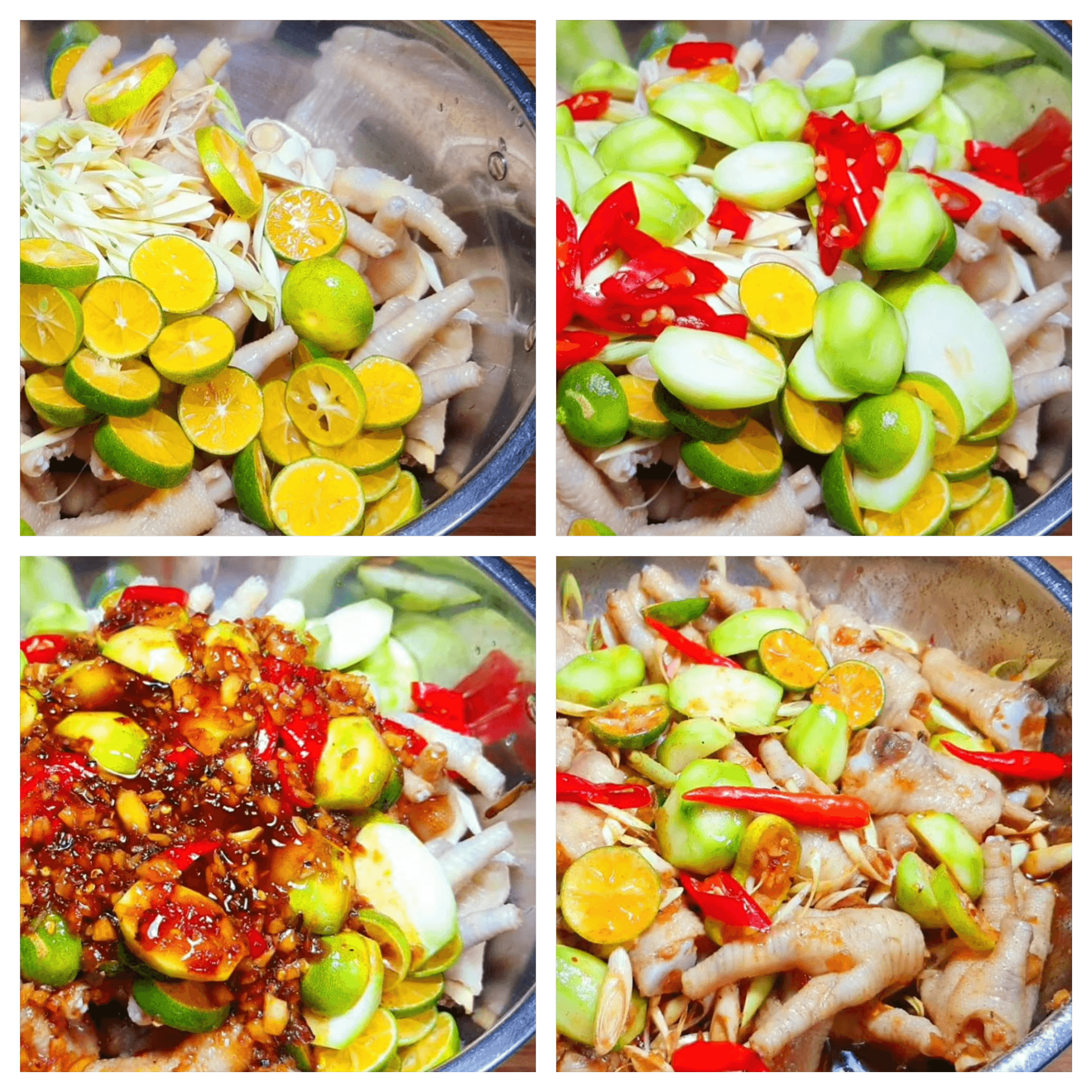 Cho chân gà vào 1 cái tô, đổ lần lượt sả, tắc, cóc và nước sốt vào. Dùng tay trộn cho phần chân gà thấm đều gia vị.