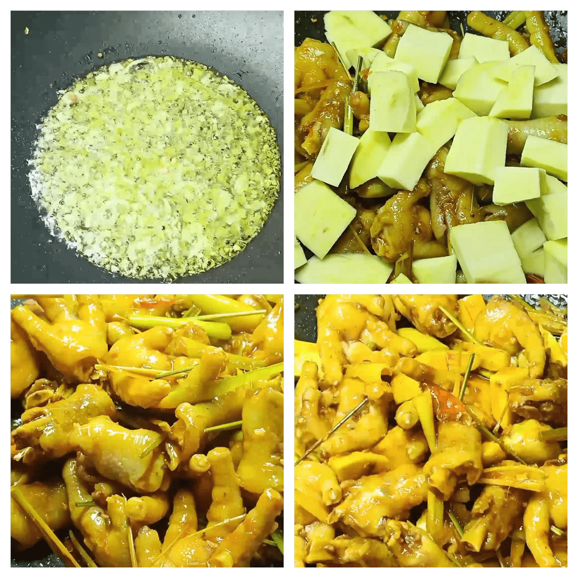 Cho vào thau chân gà 3 tép sả đập dập, 2 muỗng cà phê sả băm, 2 muỗng cà phê tỏi băm, 2 muỗng cà phê hành tím băm, 90gr sa tế, 1 muỗng canh hạt nêm, 1/2 muỗng canh đường, 1/2 muỗng canh bột ngọt, 3 muỗng canh nước mắm, trộn đều rồi ướp trong 30 phút.
