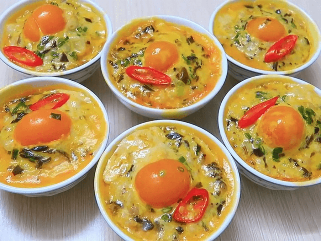 - Thực hiện: Trộn tất cả nguyên liệu trong một cái chén sứ chịu nhiệt. Đặt chén này vào nồi cơm khi cơm gần cạn nước (khoảng 10–15 phút cuối cùng của chu trình nấu). Hơi nóng từ nồi cơm sẽ làm chín trứng một cách từ từ, cho ra thành phẩm mềm mại.