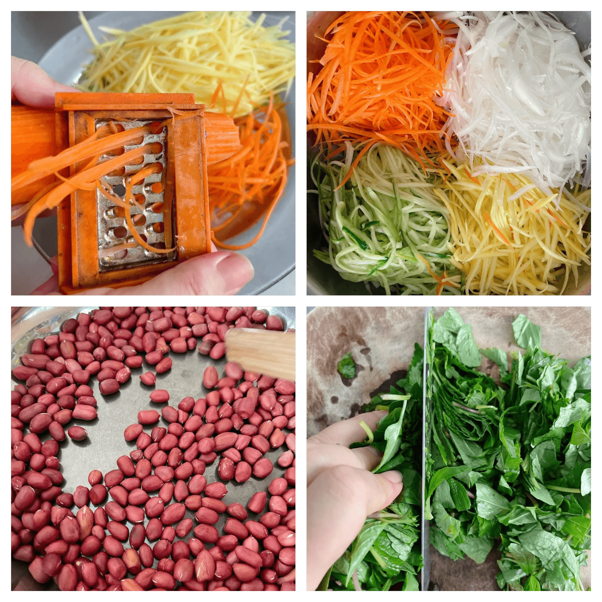 Xoài xanh, cà rốt, dưa leo bạn gọt bỏ vỏ, rửa sạch, rồi bào sợi.