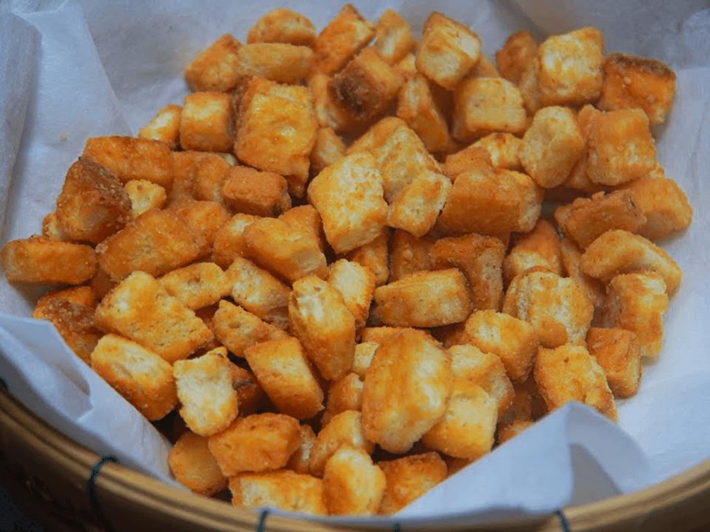 - Tóp mỡ chay bằng bánh mì: Đây là cách làm tóp mỡ chay đơn giản và phổ biến nhất. Bạn chỉ cần dùng bánh mì cũ, cắt nhỏ, rang lên và tạo hình như trên.
