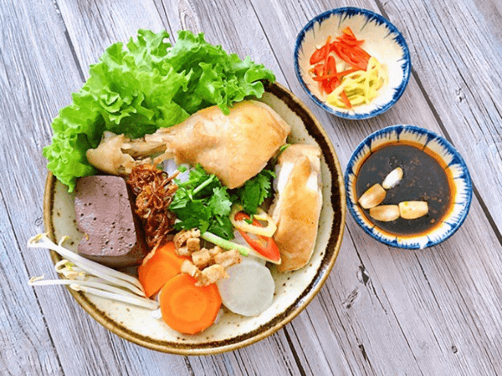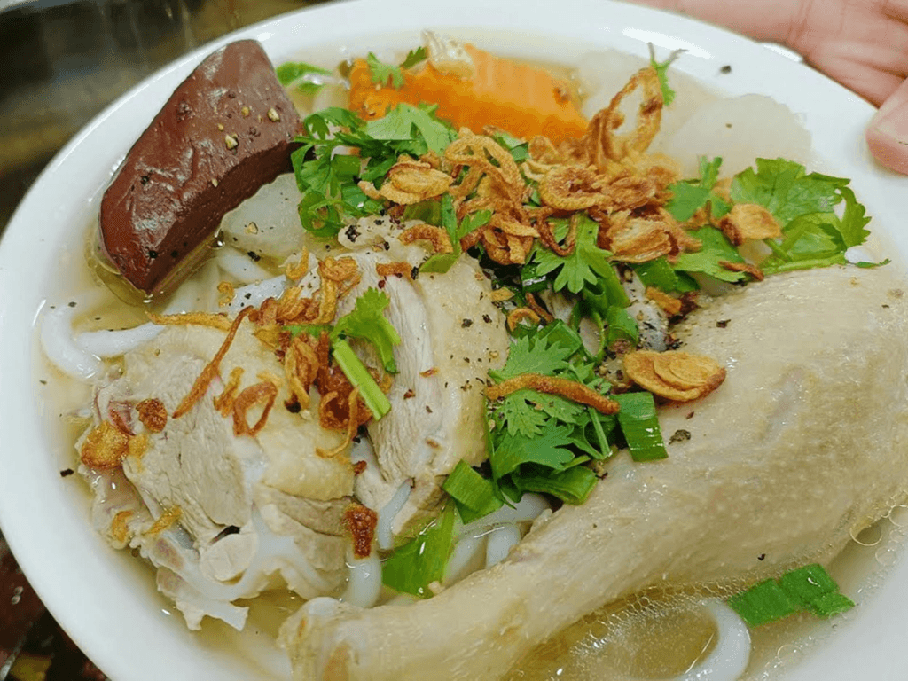 - Topping: Thịt gà xé phay (nếu có), hành phi, tiêu xay, rau thơm.