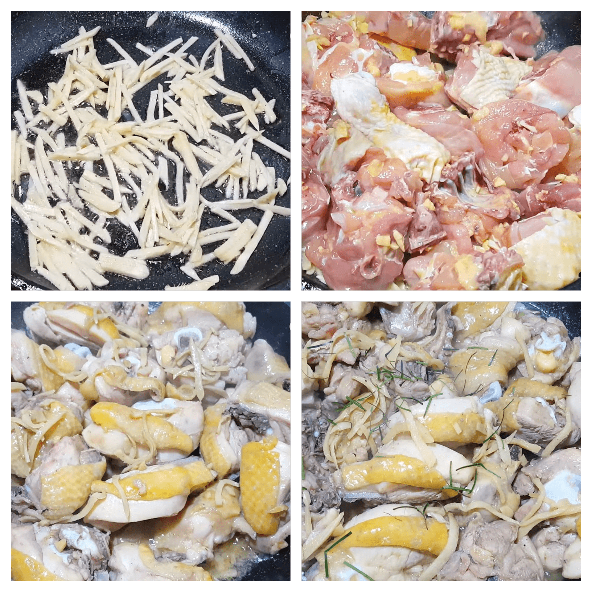 Bạn cho 1 muỗng canh dầu ăn vào chảo, đun nóng lên. Tiếp theo, bạn cho gừng thái sợi vào xào sơ với lửa lớn trong 2 phút. Đến khi gừng dậy mùi thơm, bạn cho thịt gà vào đảo đều trong 3 - 4 phút.