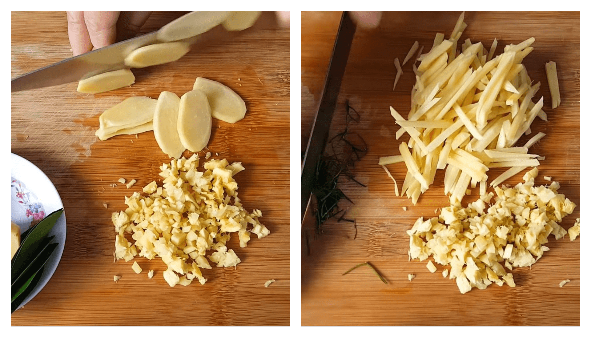 Bạn đập dập 1/3 lượng gừng. 2/3 số gừng còn lại bạn cắt sợi nhỏ.