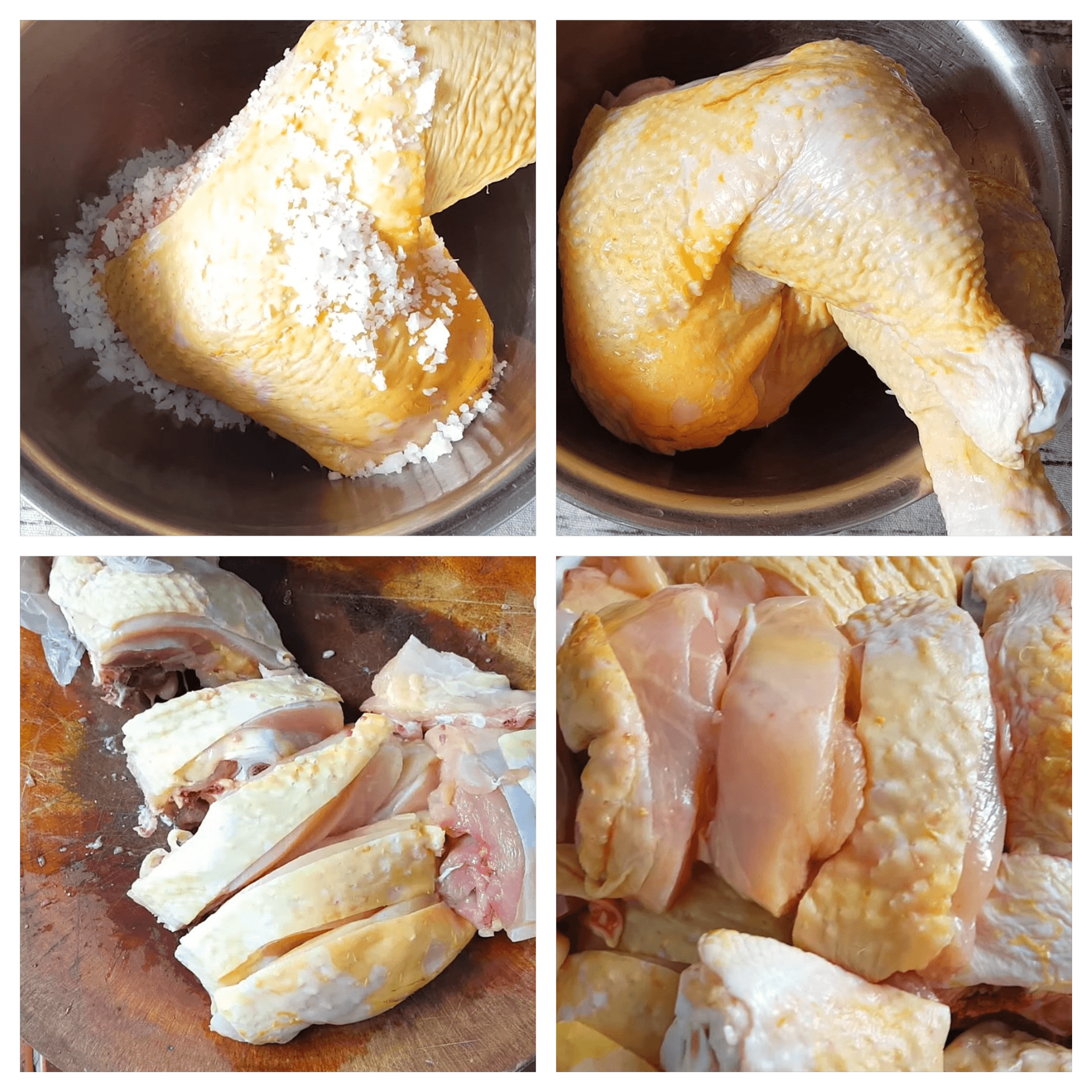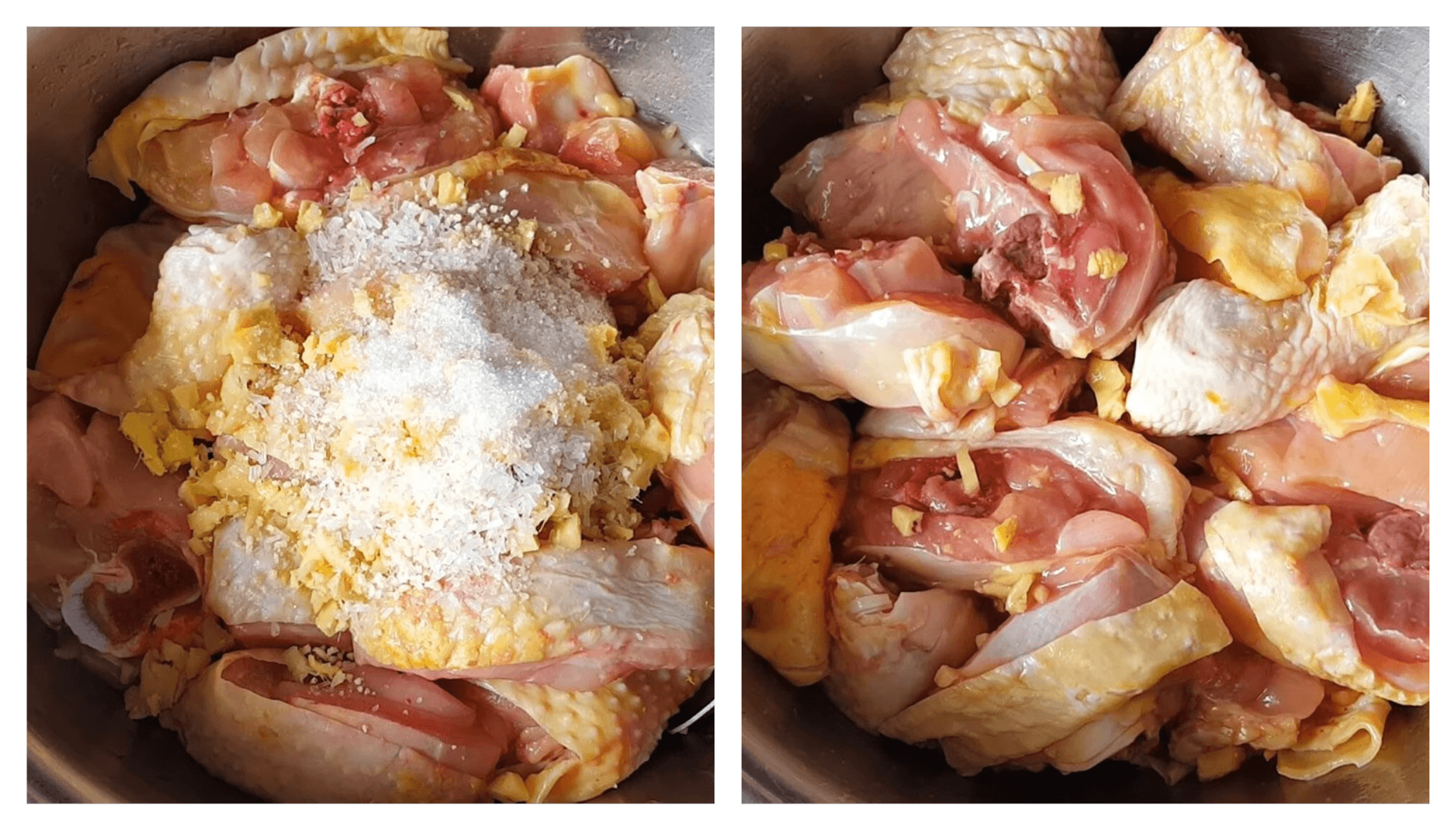 Thịt gà bạn mua về rửa sạch rồi lấy 1/2 muỗng canh muối hạt và 1 muỗng canh rượu chà xát kỹ lên miếng gà rồi rửa sạch lại với nước.
