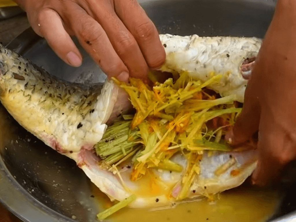 Nhét thêm gừng, rau thì là và ớt vào bụng cá cho thơm.