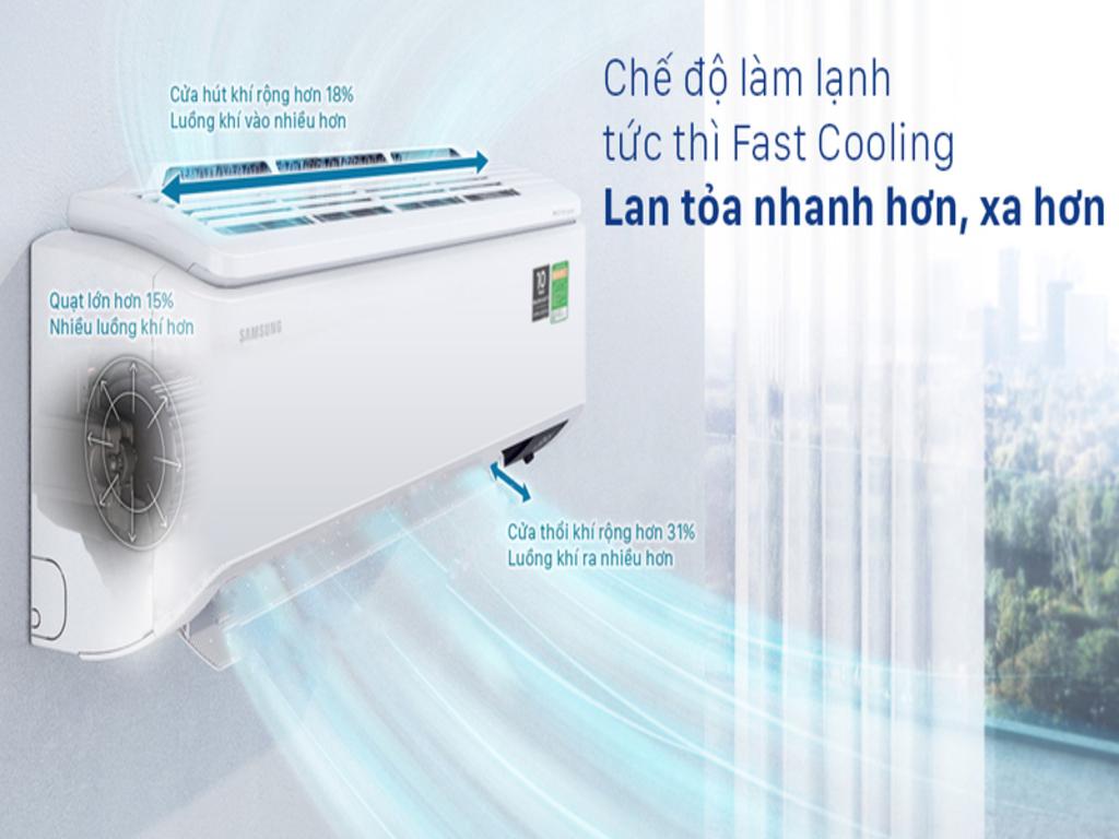 Công nghệ Fast Cooling có phần thiết kế quạt gió của máy lạnh khá lớn, kết hợp với cửa thổi khí giúp cho không khí lạnh được phân tán xa và rộng đều khắp căn phòng, nhờ vậy, thiết bị có khả năng làm lạnh nhanh đến 43% so với tốc độ thông thường.