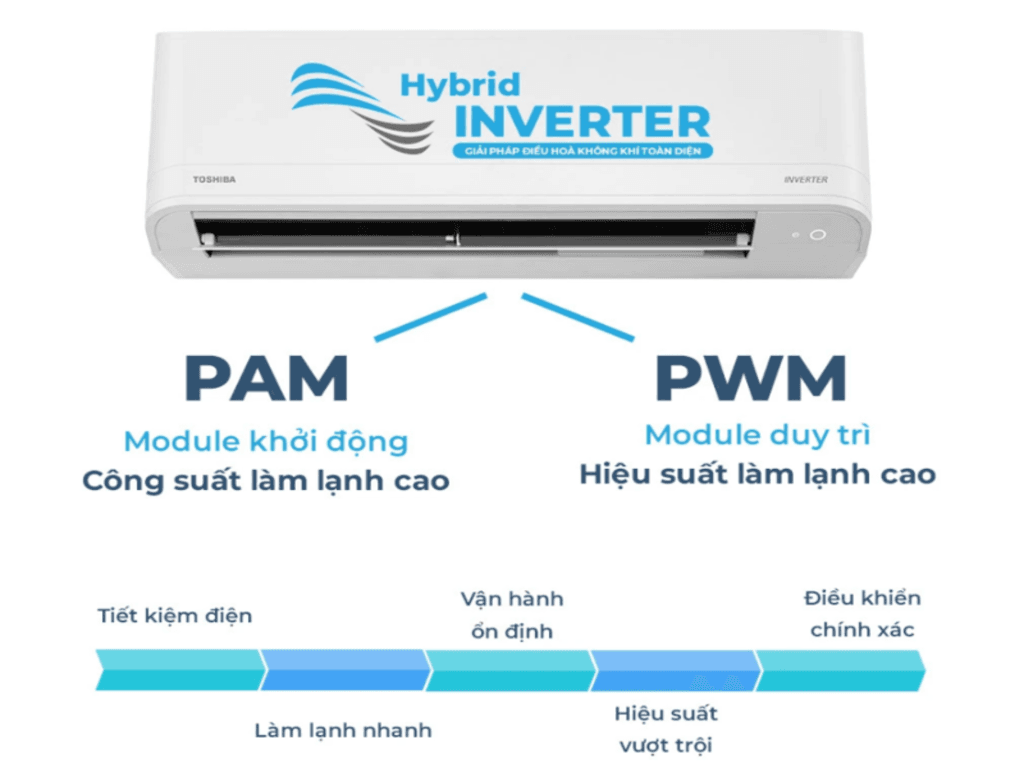 - Bộ điều khiển Hybrid Inverter: Công nghệ Hybrid Inverter sở hữu 2 module điều khiển riêng biệt PAM (Pulse Amplitude Modulation) và PWM (Pulse Width Modulation).