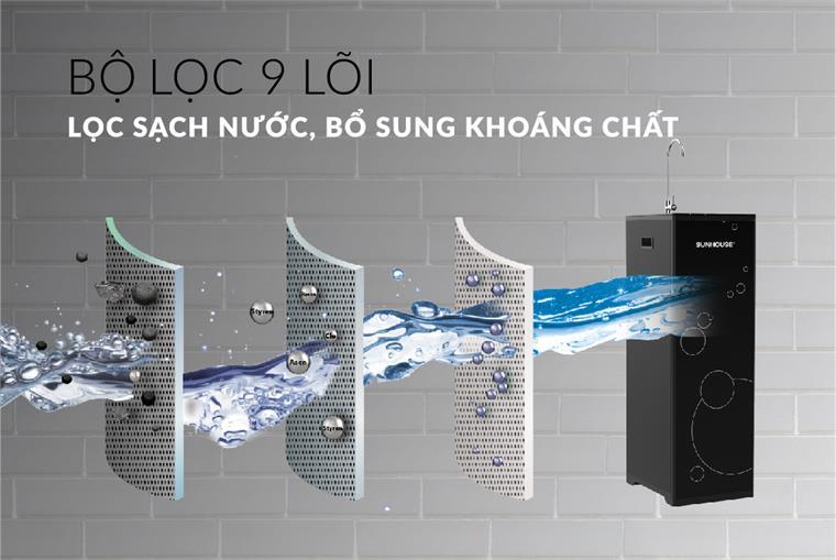 Máy lọc nước sử dụng bộ lọc 9 lõi, không chỉ lọc sạch nước mà còn bổ sung các khoáng chất hữu ích cho cơ thể. Sản phẩm gồm 3 cấp lọc chính bao gồm lọc thô, lọc tinh và bù khoáng.