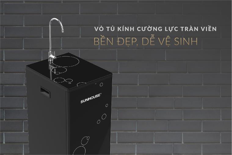 Máy lọc nước Sunhouse sử dụng vỏ tủ kính cường lực tràn viền với sắc đen phối cùng họa tiết tối giản, hiện đại mà đẹp mắt. Không chỉ vậy, chất liệu này rất dễ vệ sinh, khiến diện mạo sản phẩm bền đẹp lâu hơn.