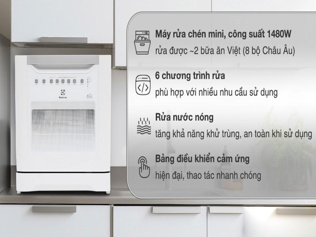 - Máy rửa bát Electrolux mini: Có giá từ 8.5 triệu đến 10 triệu đồng. Bao gồm 6 chu trình rửa: rửa vết bẩn dính cứng, rửa tự động, rửa tiết kiệm, rửa thủy tinh, rửa nhanh, tráng sơ trước khi rửa nước lạnh. Máy có công suất nhỏ, đèn LED báo chu kỳ rửa và đèn báo mức muối và nước trợ xả.