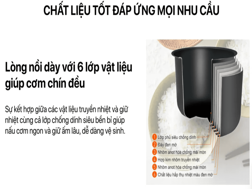 - Chất liệu cao cấp và an toàn: Lòng nồi thường được làm từ hợp kim nhôm dày, phủ lớp chống dính cao cấp, bền bỉ và dễ dàng vệ sinh, đồng thời giúp cơm không bị cháy và dính đáy nồi.
