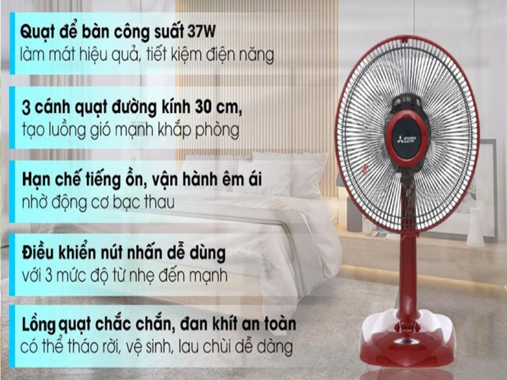 Quạt bàn Mitsubishi cũng là một thương hiệu nổi tiếng đến từ Nhật Bản, được biết đến với các sản phẩm điện gia dụng chất lượng cao. Quạt bàn Mitsubishi được đánh giá cao nhờ thiết kế chắc chắn, động cơ bền bỉ và khả năng làm mát hiệu quả. Các sản phẩm của Mitsubishi thường có nhiều chế độ gió, phù hợp với nhu cầu sử dụng đa dạng của người dùng. Đặc biệt, quạt bàn Mitsubishi được trang bị công nghệ tiên tiến, giúp giảm tiếng ồn và tiết kiệm điện năng đáng kể. Đây là lựa chọn lý tưởng cho những ai đang tìm kiếm một chiếc quạt bàn chất lượng và bền bỉ.