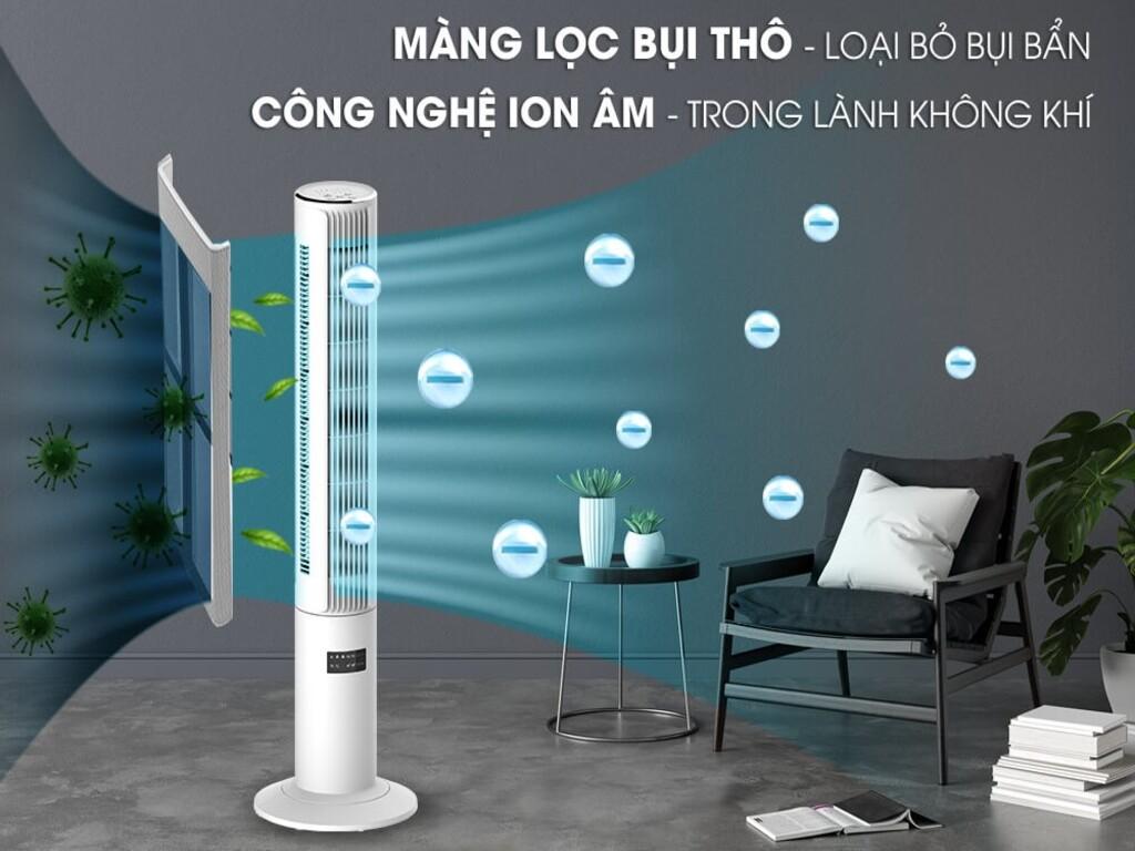Công nghệ ion âm trong quạt tháp là một tính năng tiên tiến giúp nâng cao chất lượng không khí trong không gian sống. Khi được tích hợp vào quạt tháp, công nghệ này phát ra các ion âm, các hạt này sẽ bám vào bụi bẩn, phấn hoa, vi khuẩn và các hạt nhỏ khác trong không khí, khiến chúng nặng hơn và rơi xuống đất hoặc bị hút vào bộ lọc của quạt. Kết quả là không khí trở nên trong lành và sạch sẽ hơn, giúp người sử dụng hít thở dễ dàng và thoải mái hơn.