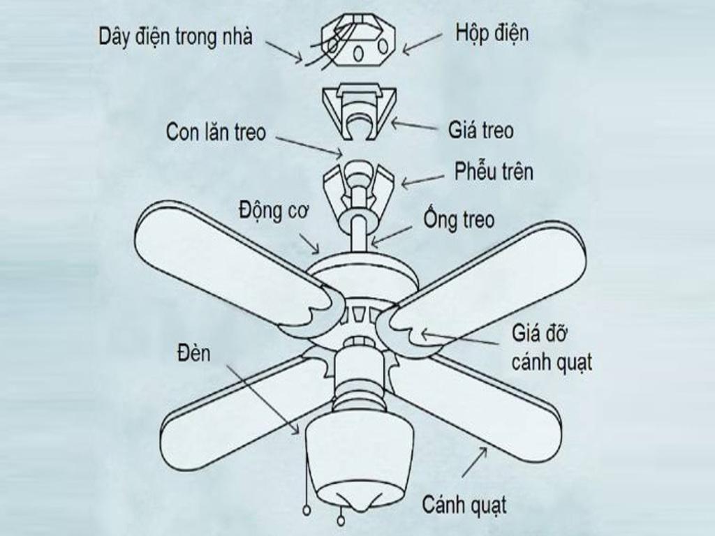 Quạt trần điện cơ thường có cấu tạo đơn giản nhưng bền bỉ, bao gồm các thành phần chính sau: