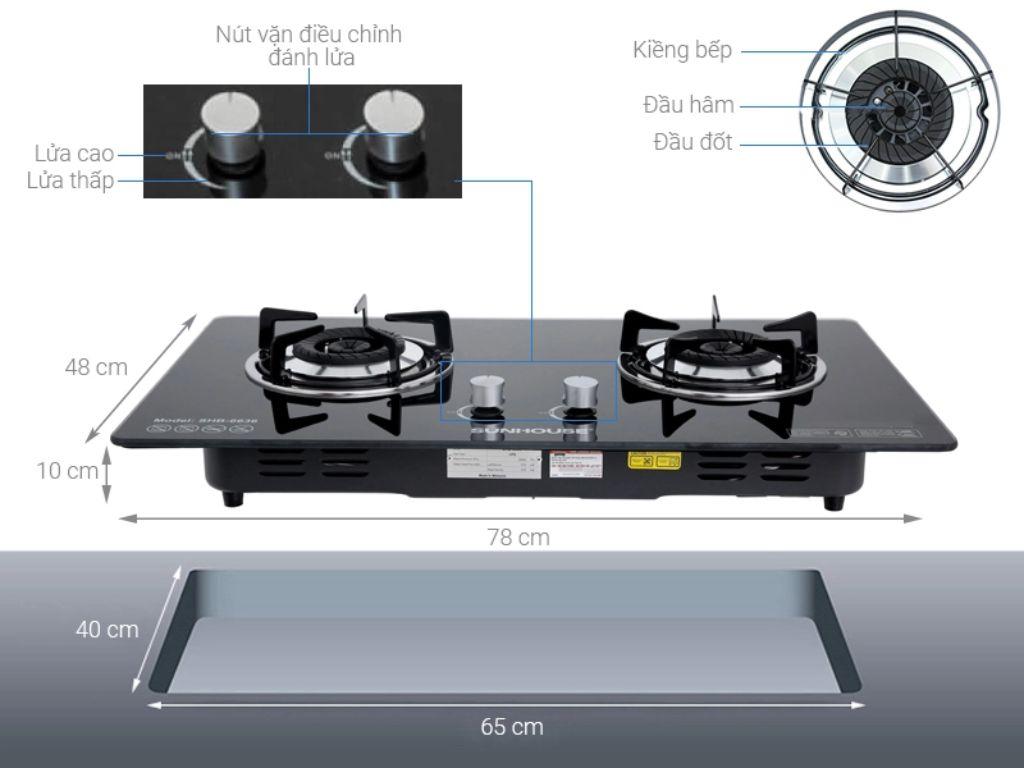 Kích thước mặt kính của bếp gas âm Sunhouse SHB-7736 là 730x430mm, kích thước khoét đá là 690x390mm.