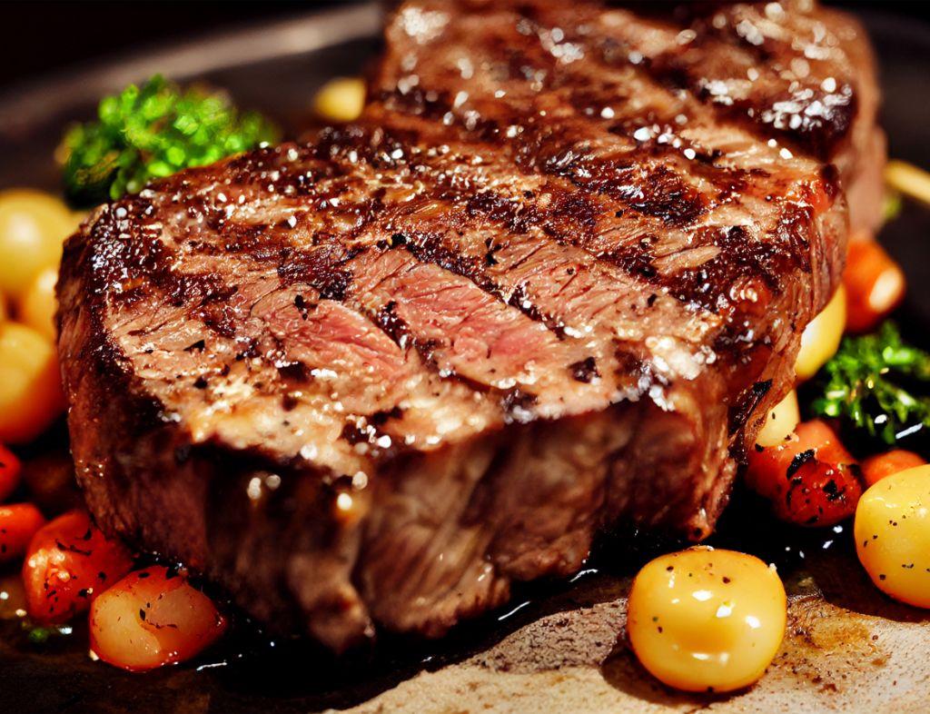 Bề mặt thịt có vẻ cháy cạnh, màu vàng óng, tạo sự hấp dẫn cho món ăn.