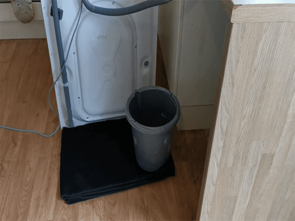 Bước 4: Bạn đặt khăn lên sàn dưới máy giặt sao cho nó che phủ toàn bộ không gian dưới máy. Sau đó, đặt xô hoặc chậu lên trên khăn. Điều này sẽ giúp hứng nước dễ dàng khi bạn tháo đường ống nước mà không làm cho sàn nhà trở nên ướt. Đảm bảo rằng khăn và xô/chậu được đặt một cách ổn định và không dễ bị di chuyển khi bạn thực hiện các thao tác tháo lắp.