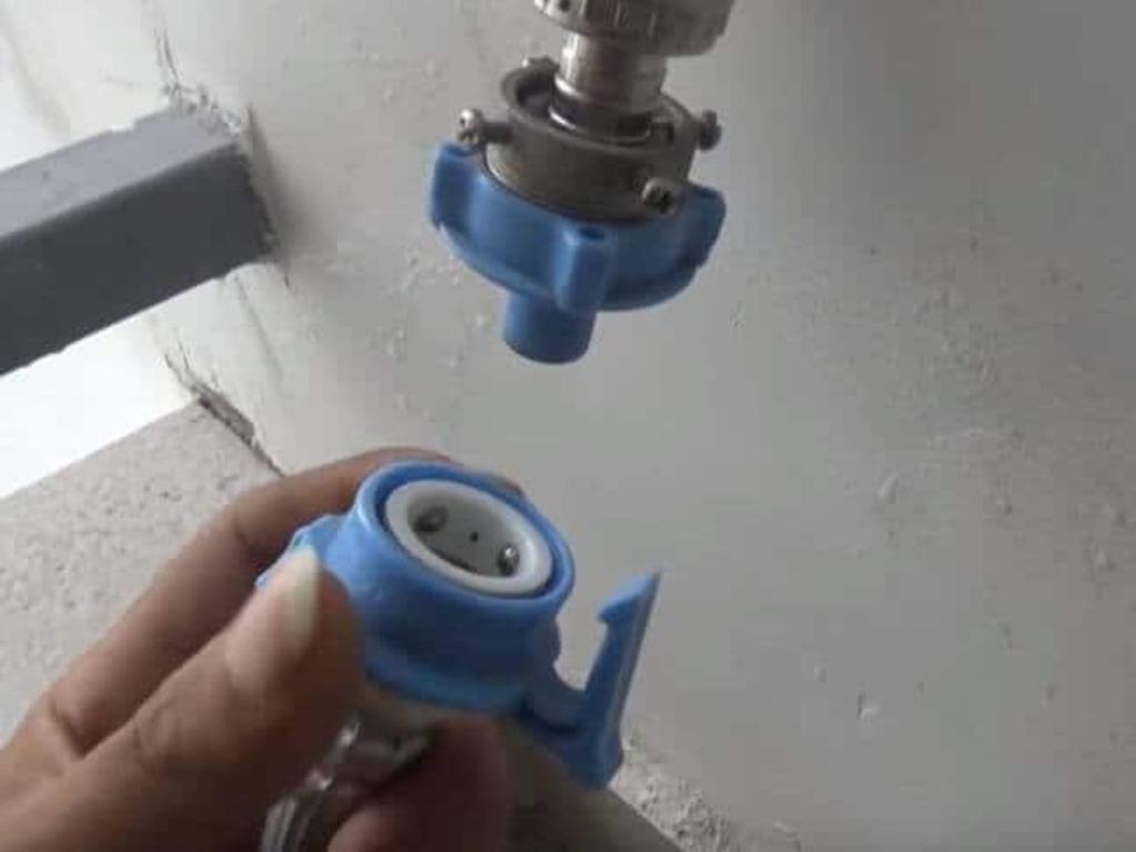 bước 6: Khi muốn gắn đường ống nước bạn sẽ vặn núm vặn theo chiều kim đồng hồ rồi kiểm tra xem ống có bị rò rỉ không. Nếu ống không bị rò rỉ bạn đặt máy vào vị trí cũ rồi cấp điện và bật nguồn nước để chạy thử xem máy có hoạt động bình thường không.