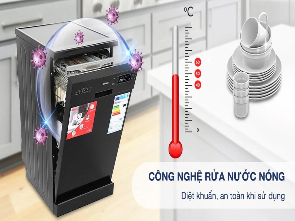 - Công nghệ rửa nước nóng với vòi phun 360 độ: Giúp rửa trôi sạch các mảng dầu mỡ bám dính trên chén đĩa. Nước nóng không chỉ làm sạch hiệu quả mà còn tăng cường khả năng diệt khuẩn, đảm bảo sức khỏe cho người sử dụng.