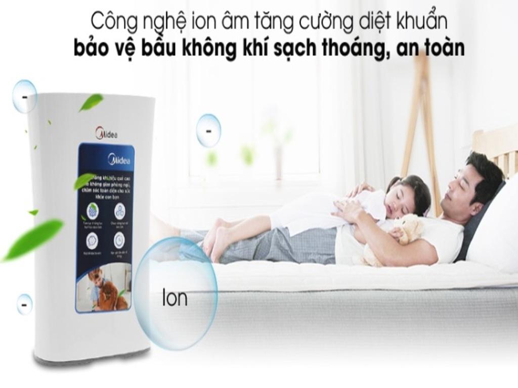 - Diệt khuẩn bằng ion âm: Công nghệ này giúp máy lọc không khí Midea diệt khuẩn và hút bụi bẩn hiệu quả hơn bằng cách tạo ra các ion âm, đồng thời tăng khả năng lọc khí và làm sạch không khí.