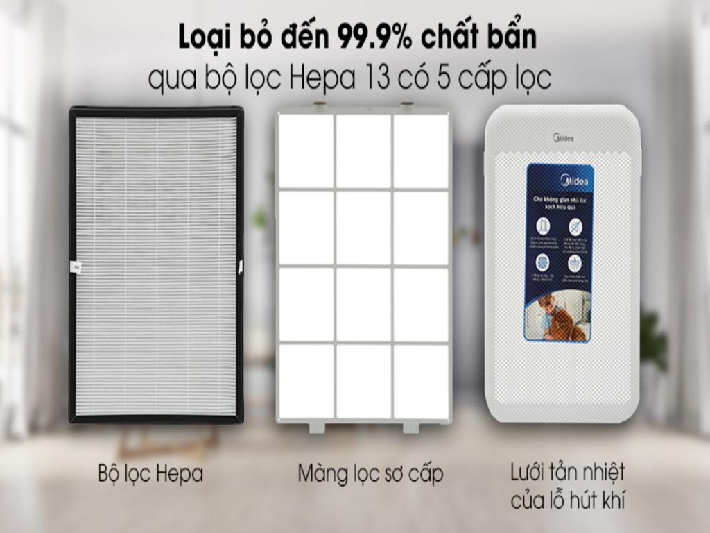 - Hiệu quả lọc cao: Midea sử dụng các công nghệ lọc tiên tiến như HEPA để loại bỏ các hạt bụi siêu mịn, phấn hoa và các chất gây dị ứng từ không khí.