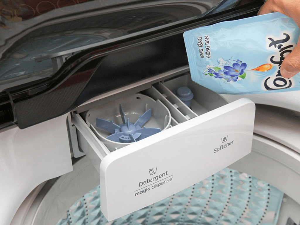 Hầu hết các máy giặt cửa trên như máy giặt toshiba cửa trên, máy giặt electrolux cửa trên,... đều thiết kế riêng một ngăn nhỏ để chứa nước xả. Cho nước xả vào máy giặt khi nào? Trước khi bắt đầu chu trình giặt, hãy mở ngăn này và đổ lượng nước xả vải vừa đủ theo hướng dẫn trên bao bì sản phẩm.