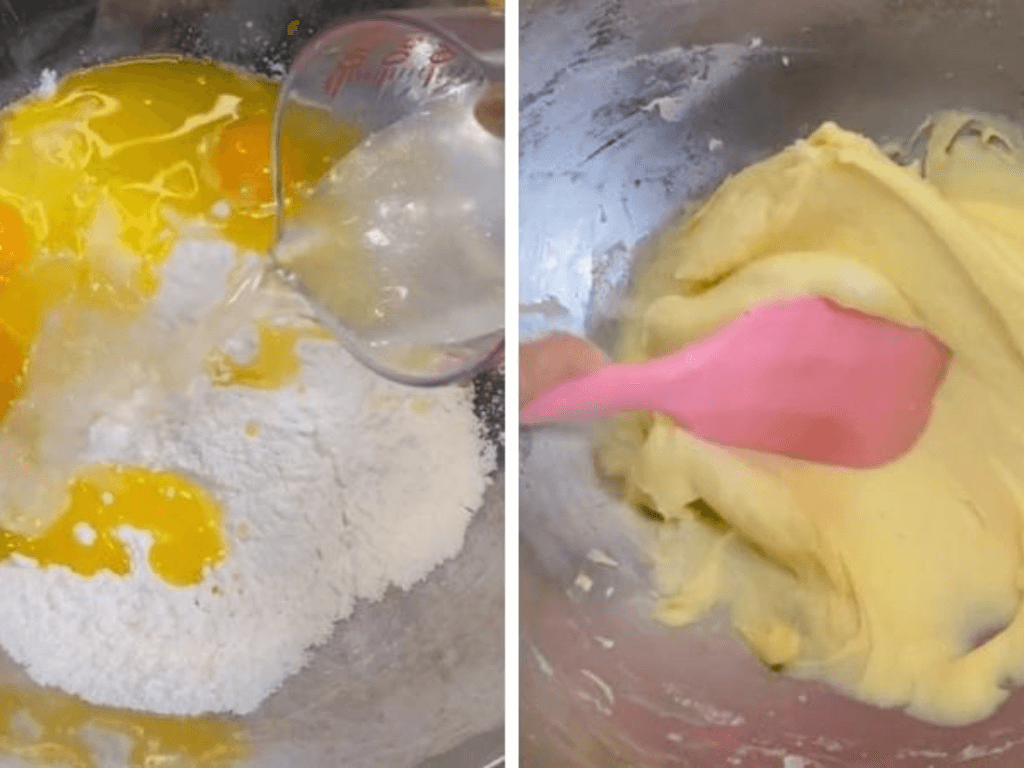 Khi hỗn hợp đã sôi, thêm bột và trộn cho đến khi không còn dính vào nồi. Sau đó, thêm 2 quả trứng và trộn đều.