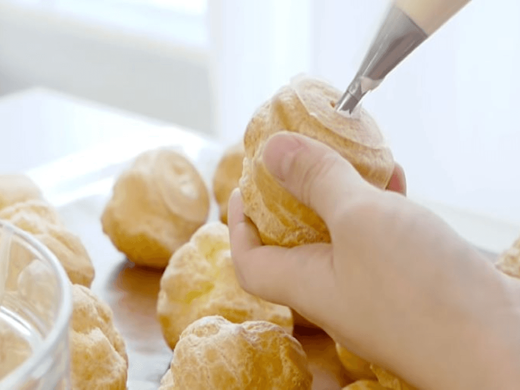 Khi bánh đã nướng chín, khoét lỗ nhỏ ở đáy hoặc cắt một đường nhỏ ở thân bánh, sau đó bơm nhân vào và hoàn thành bánh su kem.