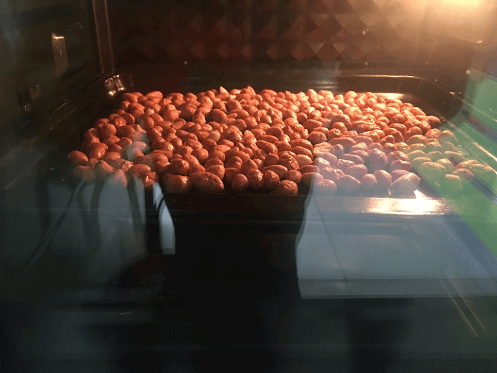 Rang lạc trong 5 phút ở nhiệt độ 160 độ C, sau đó đảo đều và tiếp tục rang trong 3 phút nữa. Tổng thời gian hết 8 phút.