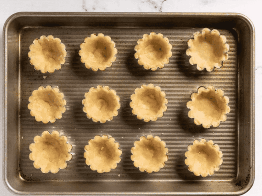 Xếp các đế bánh tart vào trong nồi và nướng ở 180 độ C trong khoảng 4 phút cho đến khi có màu vàng đều.