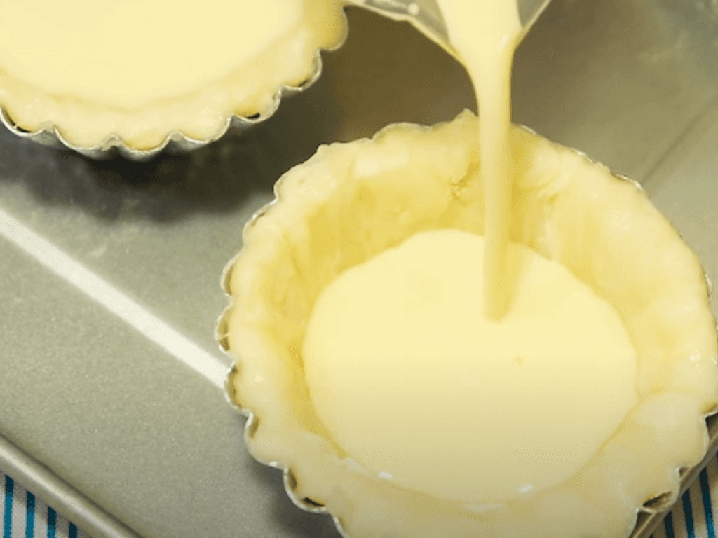 Sau đó, đổ hỗn hợp sữa trứng vào từng đế bánh tart và tiếp tục nướng thêm 7 phút ở 180 độ C cho đến khi bánh chín vàng và nhân bên trong đặc hồng.