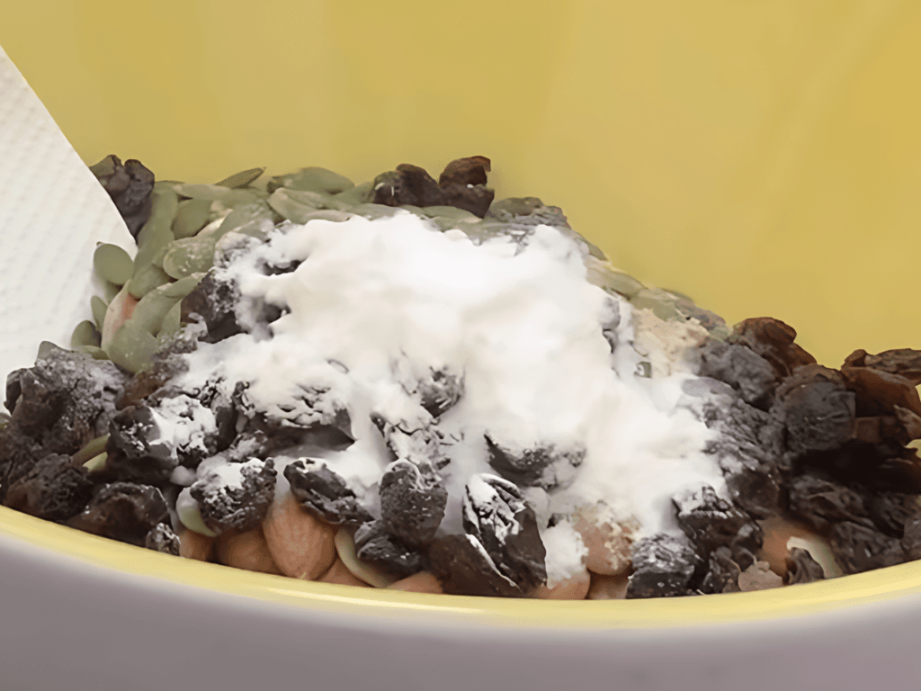 Trộn đều 80g hỗn hợp hạt với khoảng 10g bột yến mạch.