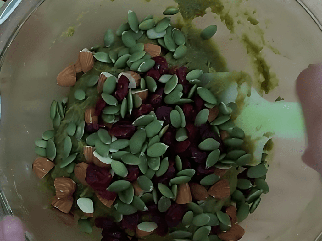Trong một tô lớn, kết hợp bột mì nguyên cám, hạnh nhân đã băm nhỏ, hạt bí xanh, nho khô và các loại bột: bột nở và baking soda.