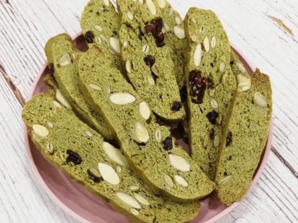 Bánh biscotti trà xanh sẽ có màu xanh nhạt và hương thơm đặc trưng của trà xanh. Khi ăn, bạn sẽ cảm nhận được sự giòn của bánh và vị ngọt bùi béo ngậy từ các loại hạt.