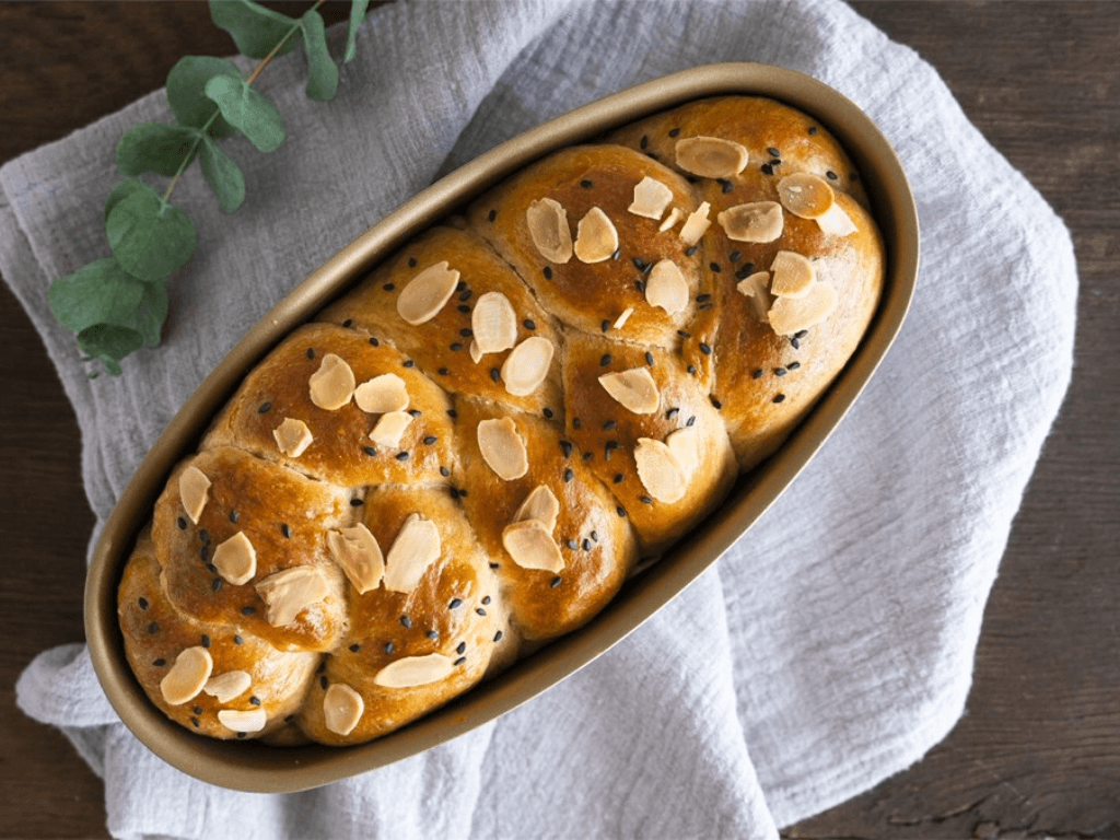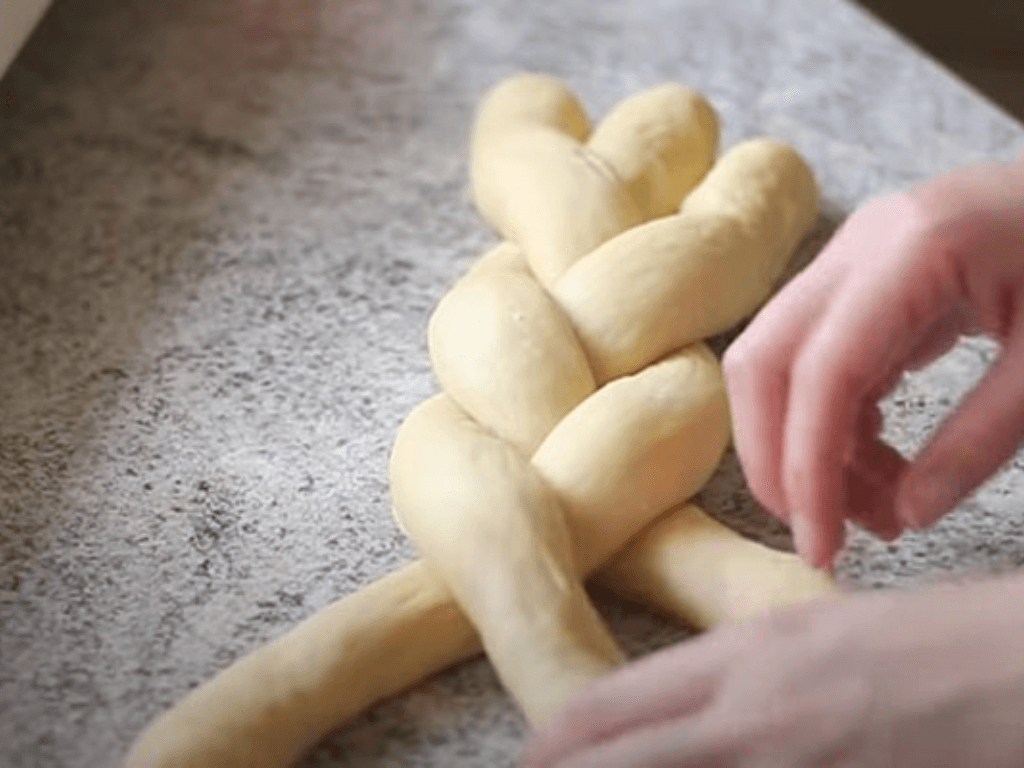 Tiếp theo đó, hãy sử dụng 3 miếng bột để thắt bím lại với nhau và cho vào khuôn đã lót sẵn giấy nến. Bọc kín khuôn bột bằng màng bọc thực phẩm và để nghỉ thêm 20 phút ở nơi ấm áp cho bột nở gấp đôi.