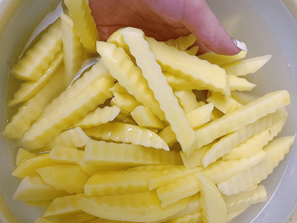 Sử dụng dao để cắt khoai tây thành từng khúc vừa ăn. Đồng thời, bạn ngâm khoai tây vào thau nước muối pha loãng trong khoảng 5 phút.